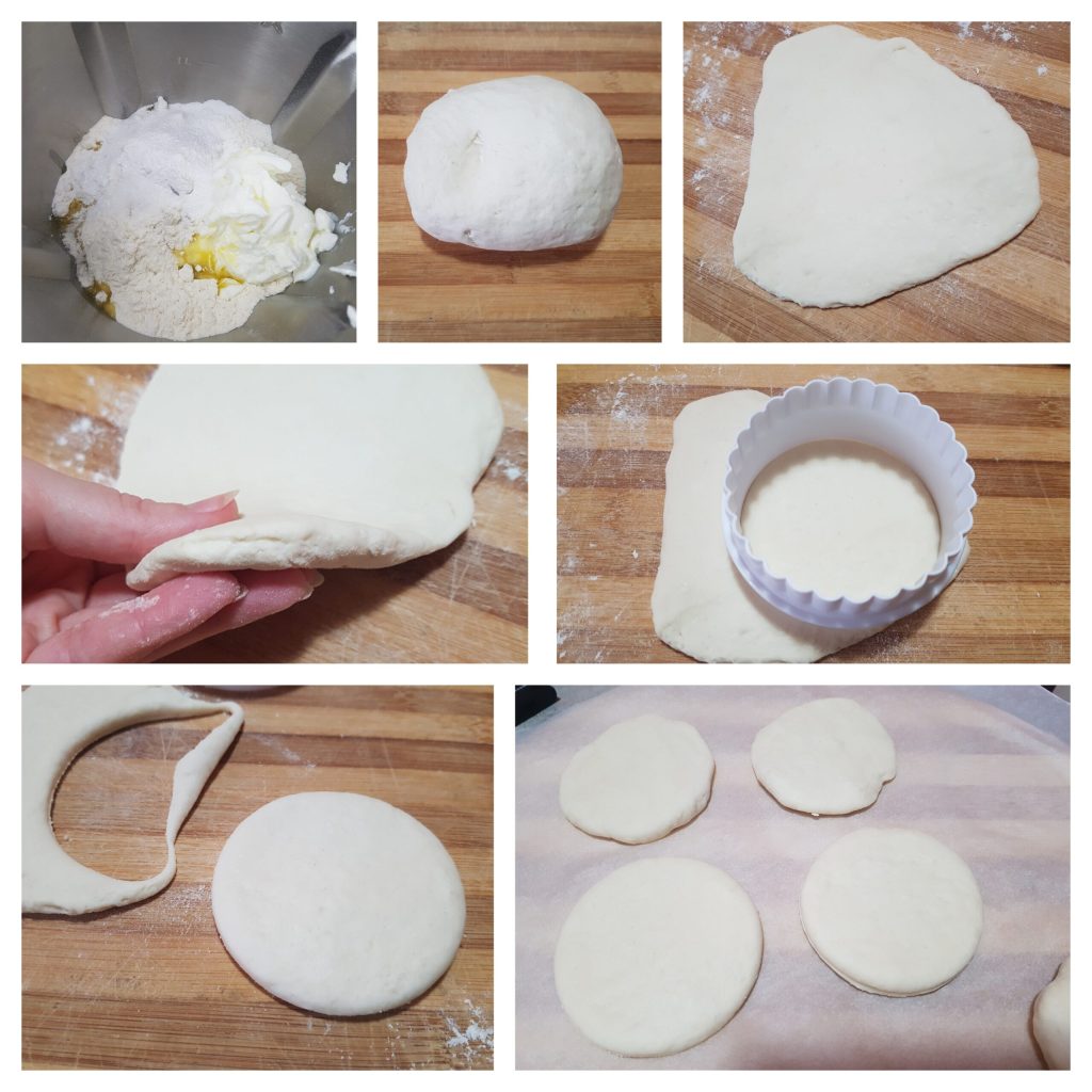 • To make these delicious skillet flatbreads, first take the Greek yogurt out of the fridge and let it sit at room temperature for 10-15 minutes. Mix all the ingredients in a bowl to obtain a smooth and homogeneous dough. You can use a food processor or mix everything by hand. Once the dough is ready, let it rest for 10 minutes. Then roll it out with a rolling pin to a thickness of 3/8 inch, and cut out discs using a cookie cutter or glass.