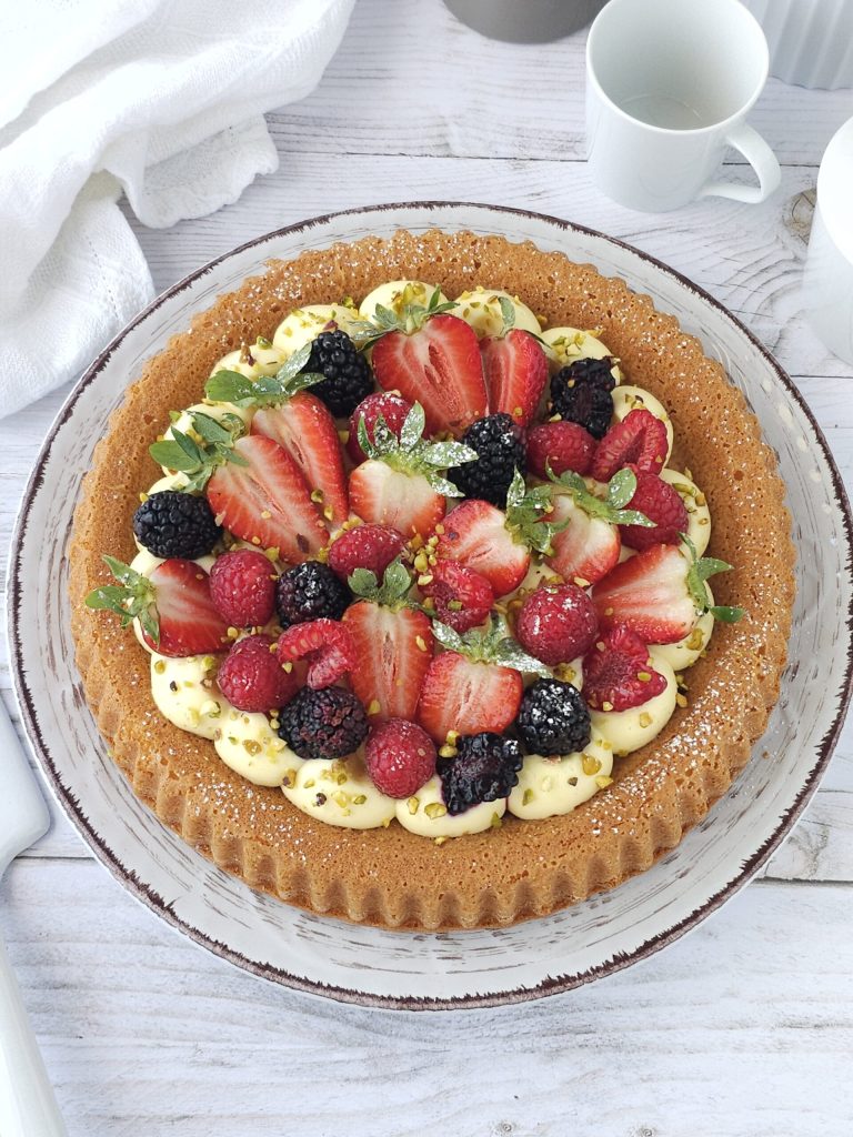 Insert the diplomatic cream into a piping bag with a smooth nozzle. Take up the soft tart and decorate the base as shown in the photo by creating petals and forming a flower. Finally, decorate the entire surface with berries and crushed pistachios.