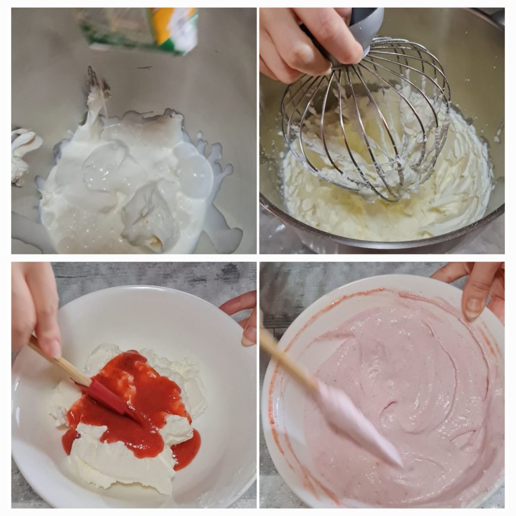 Let it cool slightly. In a large bowl whip the mascarpone, powdered sugar and the very cold cream from the fridge with electric beaters; when the mixture is fluffy, add the now-cooled dissolved gelatin and continue whipping. Take the strawberry purée and fold it into the mixture gently from the bottom up so as not to deflate it. When ready, refrigerate to set for 30 minutes.