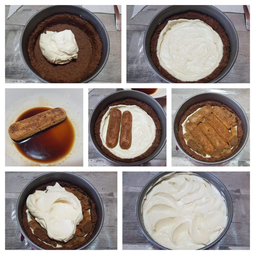 Take the pan from the freezer and pour in half of the cream. Layer it with soaked ladyfingers in coffee and finish with more cream, creating wavy movements to give the cheesecake a more attractive look. Place in the freezer for 5-6 hours or overnight.