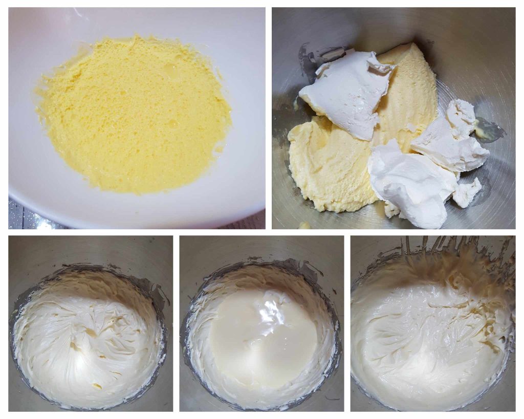 • When the cream is well chilled, place it in a bowl and add the cold mascarpone from the fridge. Beat with electric whisks or simply in a stand mixer until you get a fluffy and homogeneous mixture. Finally, pour in the condensed milk in a slow stream and continue to beat. Once the mixture is ready, place it in the fridge for a few minutes.