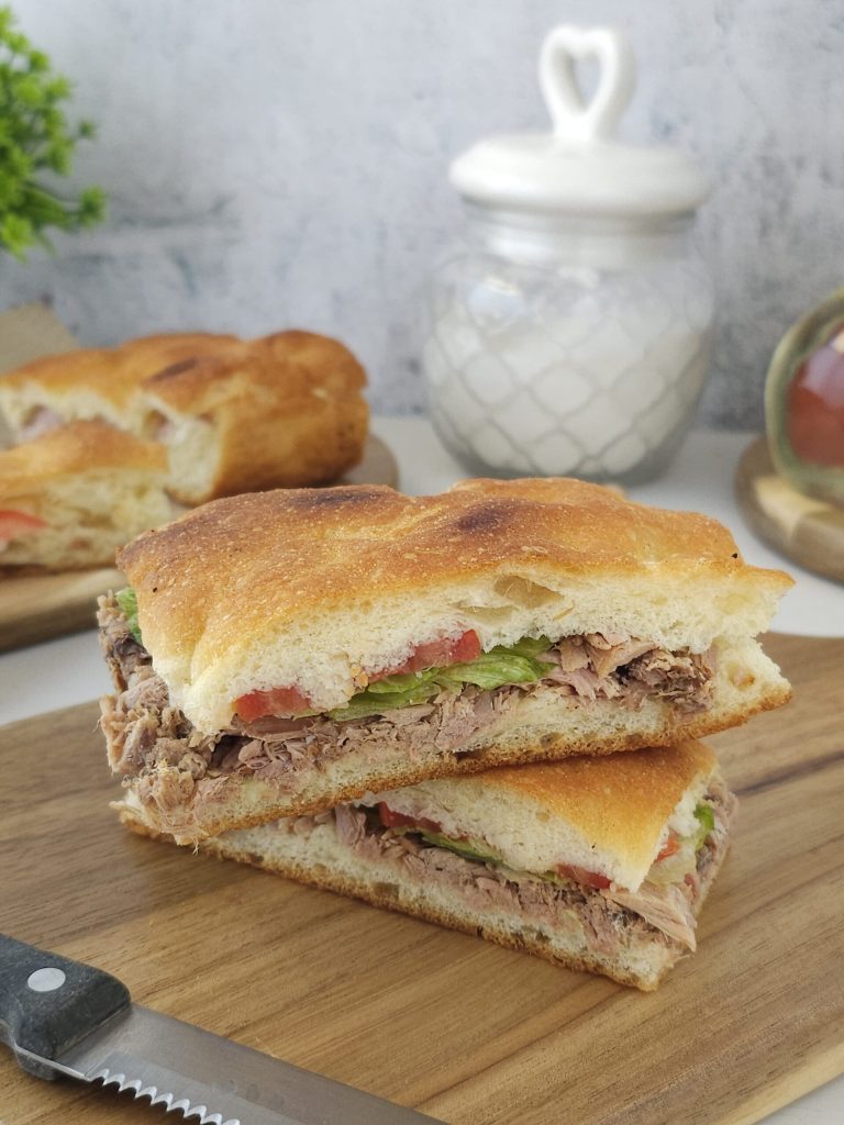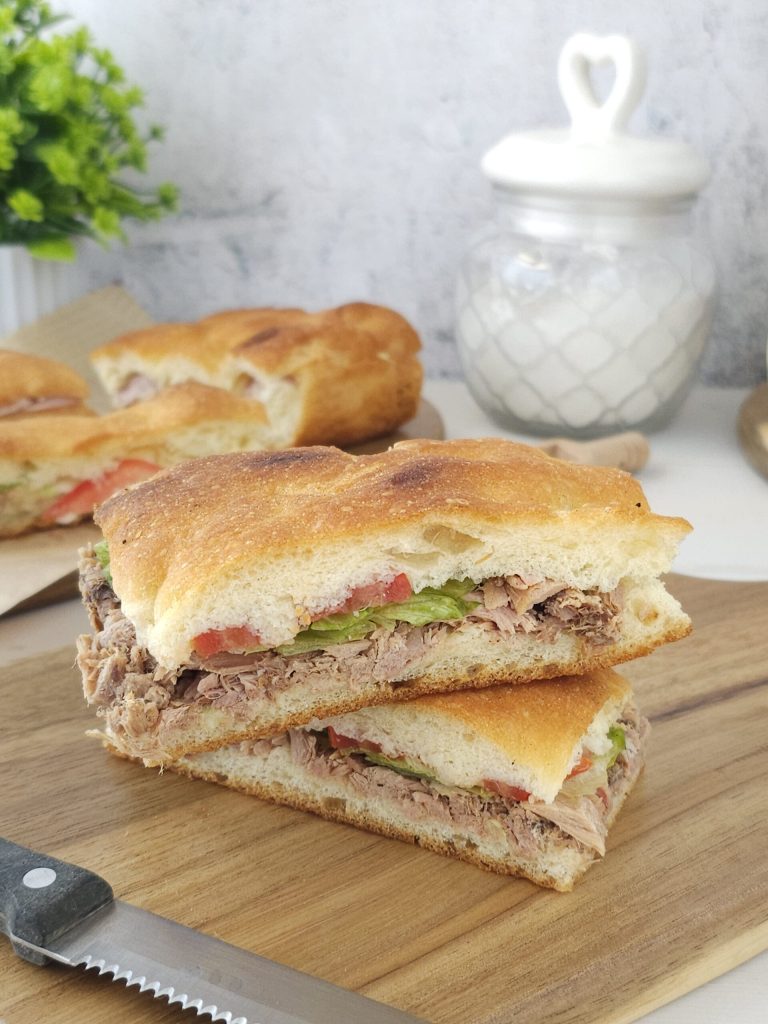 Hello friends, today I present you with this delightful white focaccia stuffed with tuna and salad to enjoy on any occasion. Simple and quick to make, it can be stuffed in any way or enjoyed plain without filling. Below you will find the recipe.