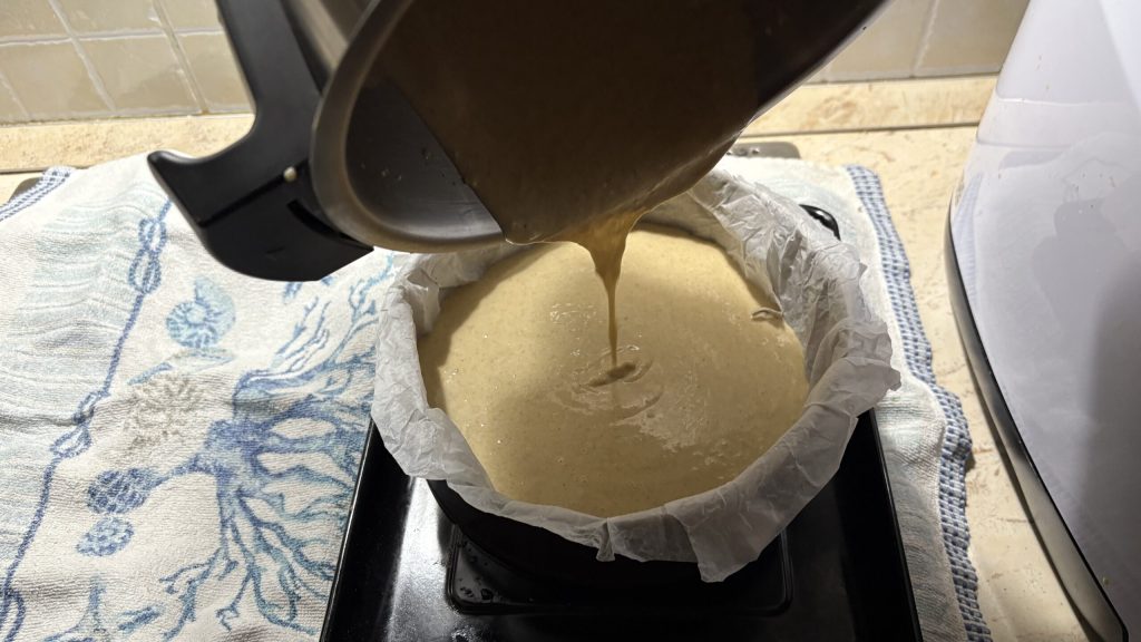 Pour the batter into a 9-inch springform pan lined with parchment paper.