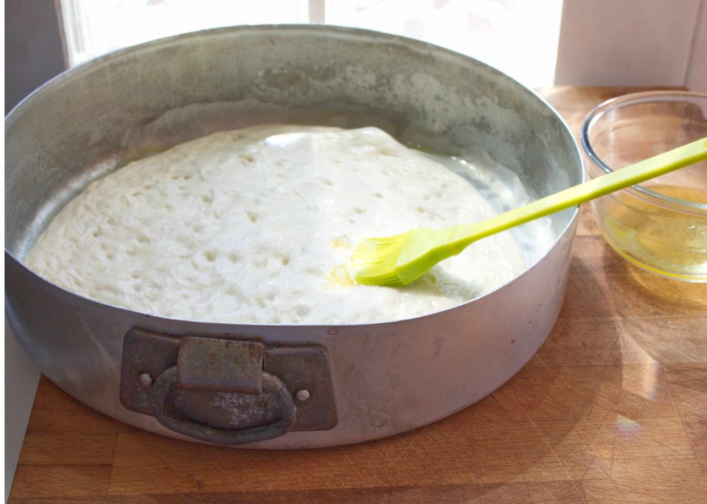 Spread the dough in a baking tray lined with slightly dampened baking paper and brush the water, oil, and salt mixture over the entire surface of the focaccia.