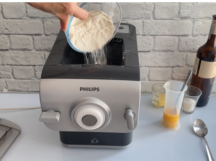 Turn on the Pasta Maker, remove the lid, and pour in the flour, put the lid back on and select the icon with the egg.