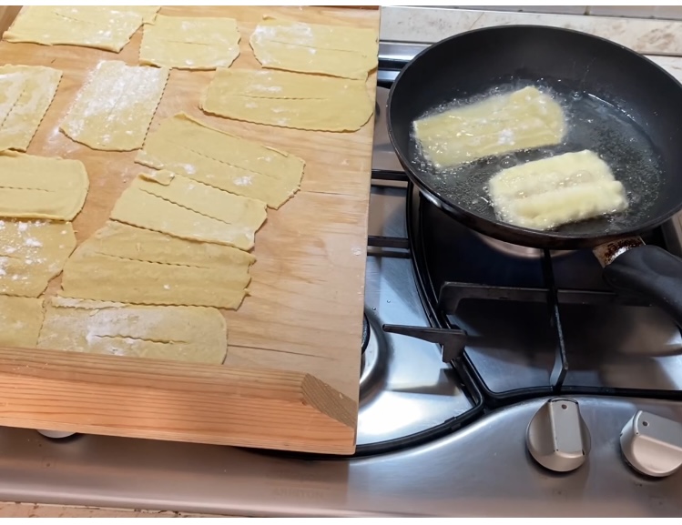 Fry the chiacchiere in hot seed oil (you will see bubbles forming).