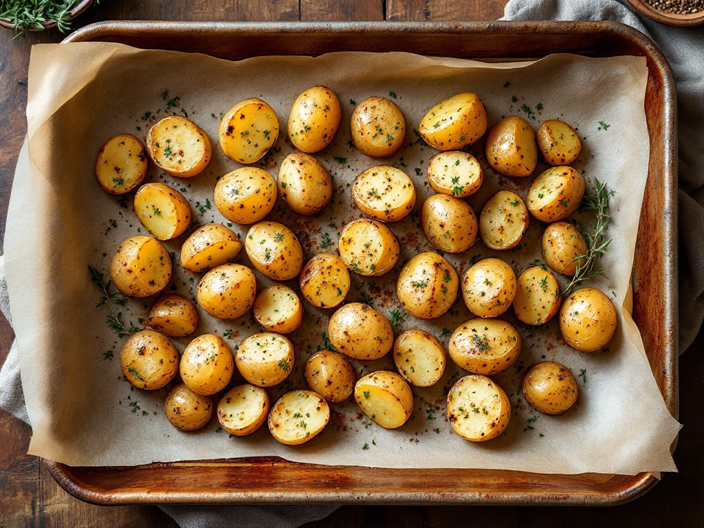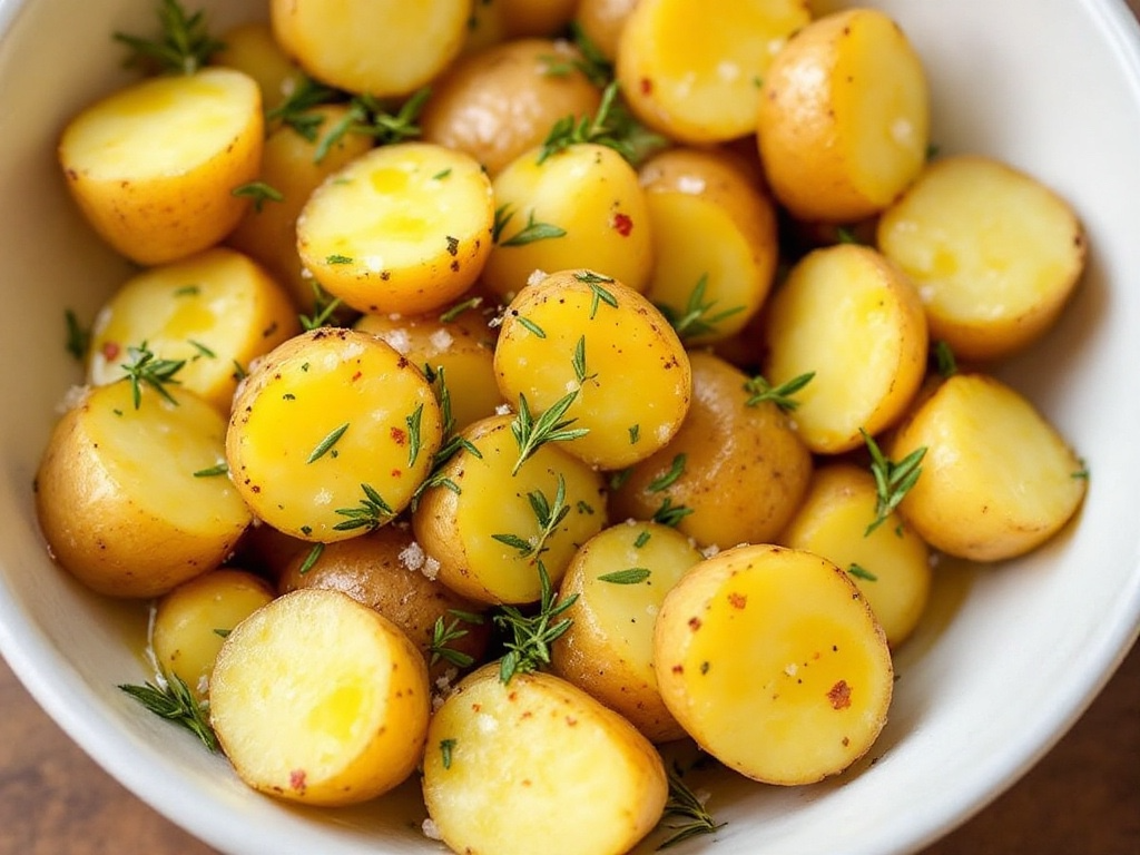 In a large bowl, combine the halved baby potatoes with 3 tablespoons of extra virgin olive oil, 2 chopped garlic cloves, 1 teaspoon of dried thyme, 1 teaspoon of dried rosemary, 1/2 teaspoon of crushed red pepper flakes (optional), and a good amount of salt and pepper. Mix everything thoroughly until the potatoes are evenly coated with the seasoning.
