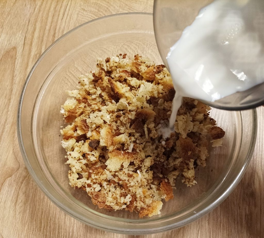 Crumb the bread slices and coarsely chop them, add the milk and work it with your hands to moisten well.
