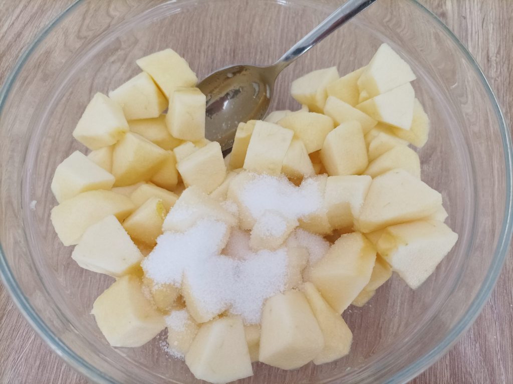 Clean the apples, remove the core, and cut them into small cubes. Put them in a container and add the sugar and lemon juice, stir well, and let them sit for 20 minutes.