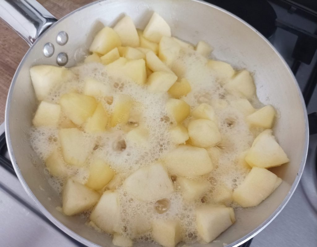 After the resting time, take the saucepan and pour in the apples, turn on low heat, and cook for about 10 minutes until the apples are well wilted.
