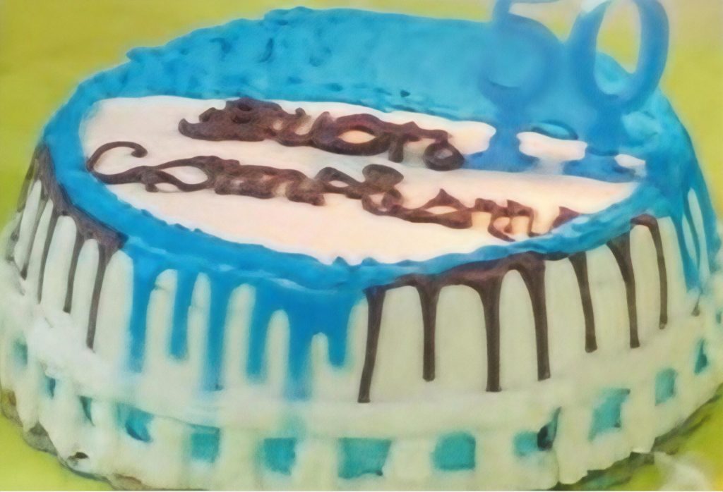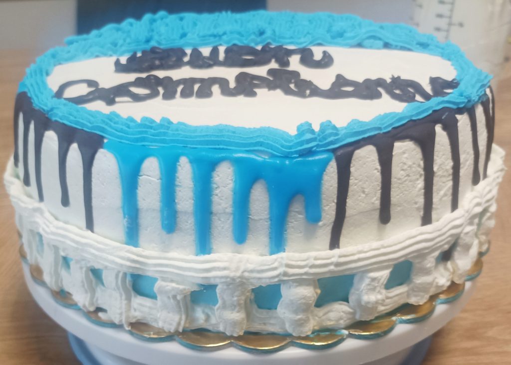 I decorated it very simply, coloring part of the cream for a lateral side and the top, then I created drips with a glaze made of powdered sugar, water, and blue color alternating with melted dark chocolate with a part of butter.