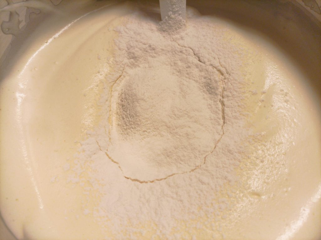 Then sift the flour and gradually add it with a spatula, mixing from bottom to top. Once all the flour is incorporated, add the vanilla, or a packet of vanillin mixed with the flour.