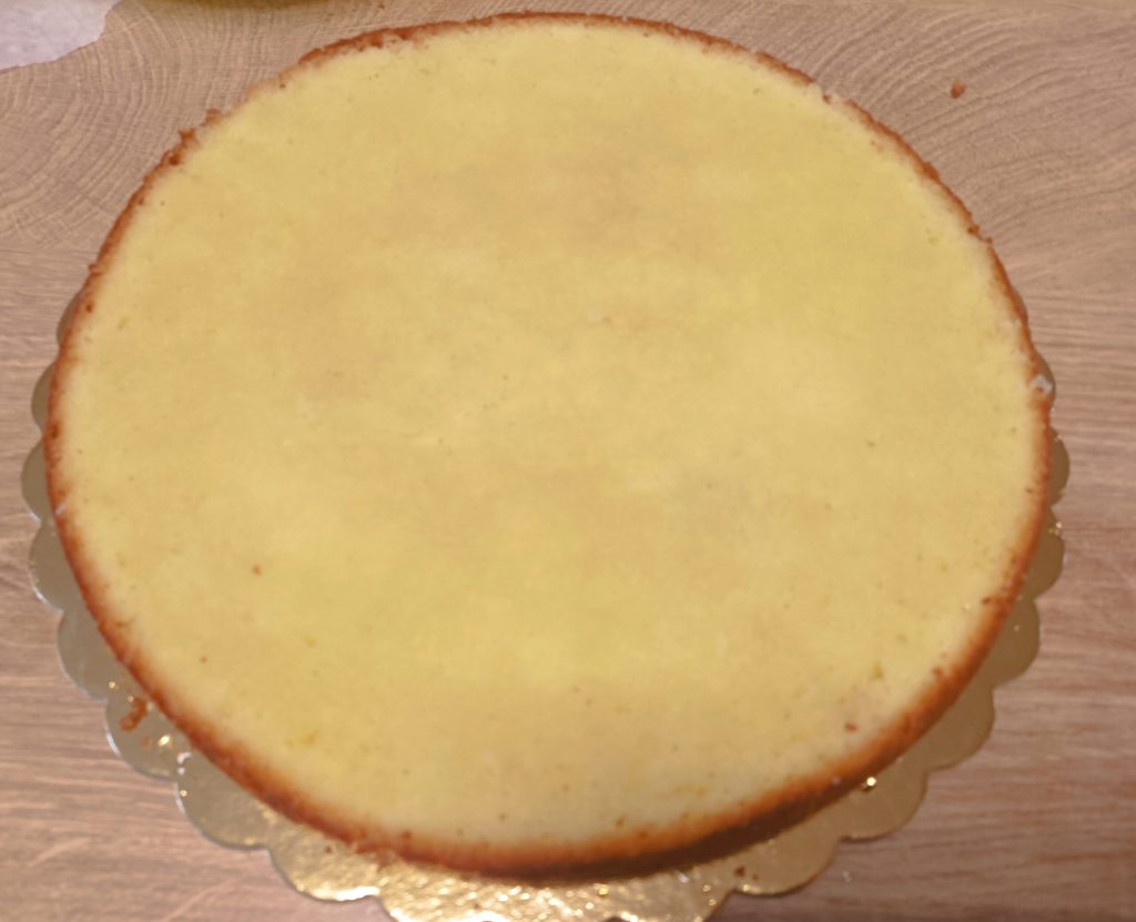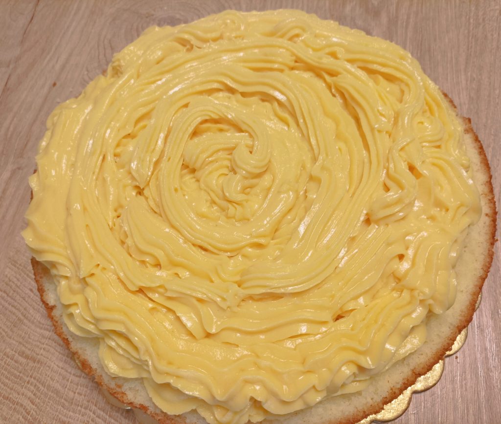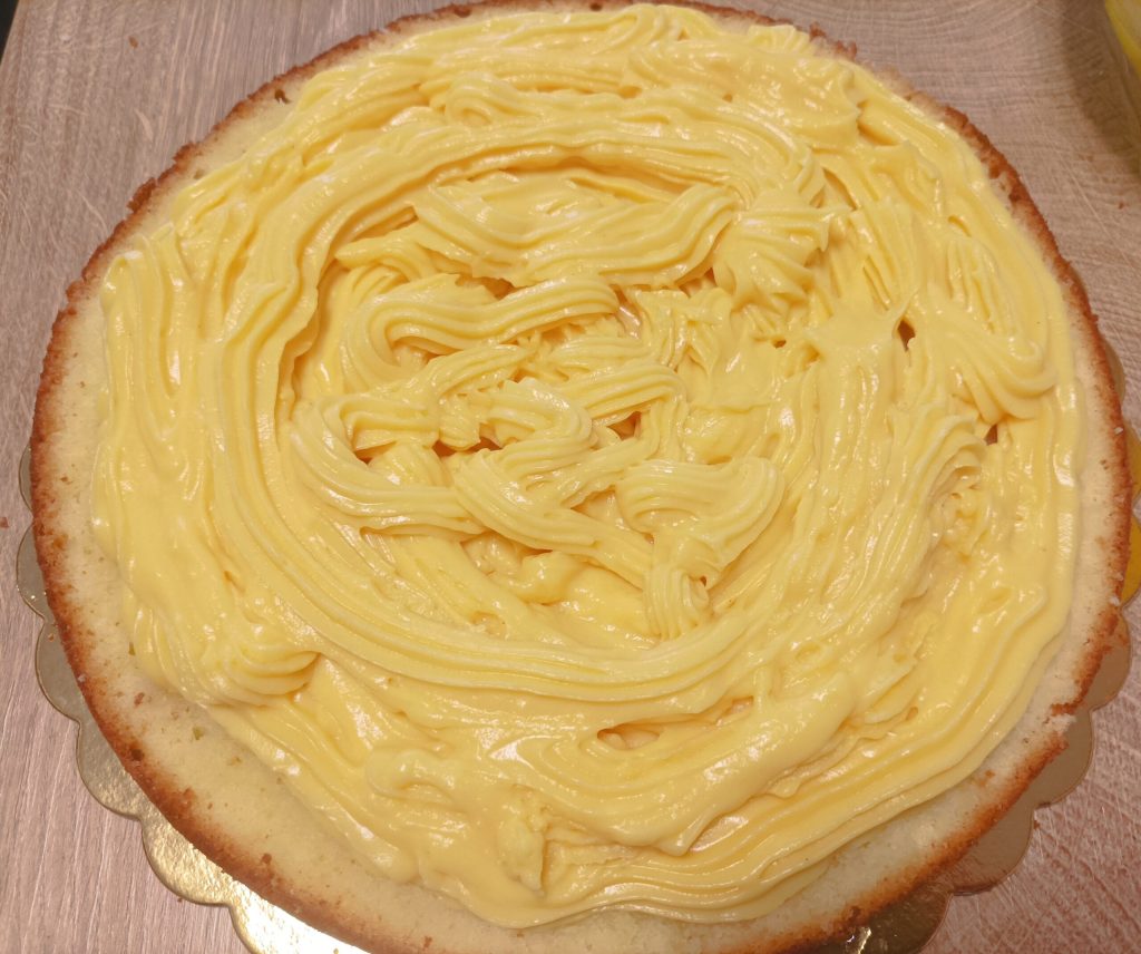 Cover with the remaining custard and finish with the third disc, always soaking it first and then covering it with custard, also soak the surface of the last disc on the outer part. (I removed the slightly darker part of the sponge cake to have a lighter base, but if you want, you can avoid it).