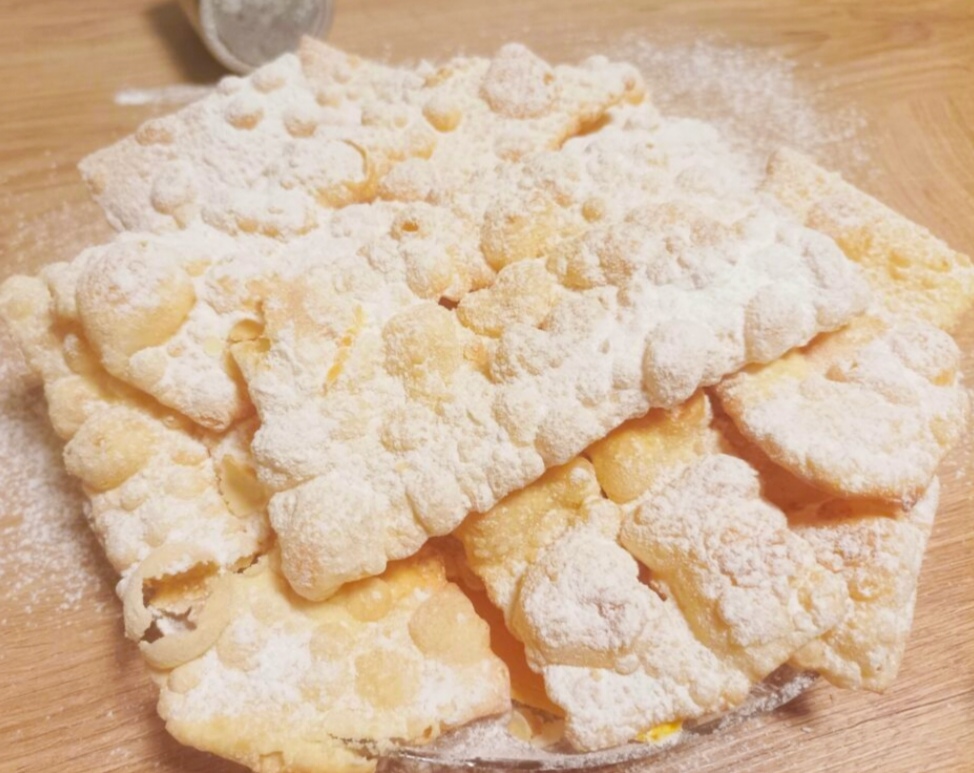 The crispy Carnival fritters with many bubbles. Each region has its name, frappe, cenci, bugie, cròstoli, etc., they are rectangles with cuts in the center, made with a simple dough, rolled out into a very thin sheet, and then fried, garnished with a lot of powdered sugar. It’s a tasty, delicate, and crunchy dessert that makes both adults and children happy. There are different variations for the dough: for the alcoholic ingredient, some use grappa, marsala, limoncello, wine, etc., while for the fat part, oil, butter, or lard, but all are wonderfully good. Remember that chatting is good for you……!!!! Here’s my recipe.