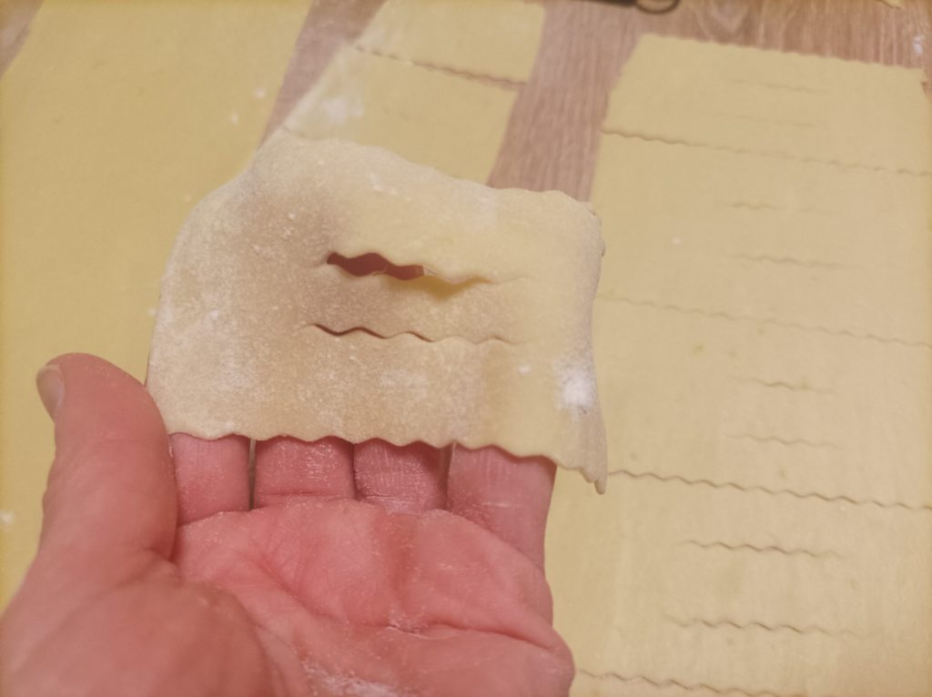 After the time has passed, divide the dough in half, wrap one part again in plastic wrap, and start rolling out the other with the pasta machine, first at the widest position (number 1 of the machine) and then to the thinnest (I rolled it to number 6). If it sticks a bit, use some flour.