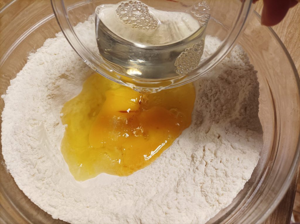 In a bowl, mix the flours, then add the sugar, eggs, vanilla extract, a pinch of salt, and the wine.