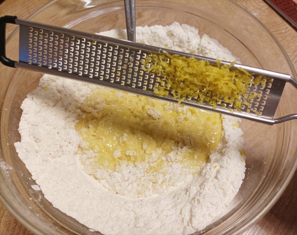With a fork, start mixing to slightly absorb the flour, add the softened lard and lemon zest.