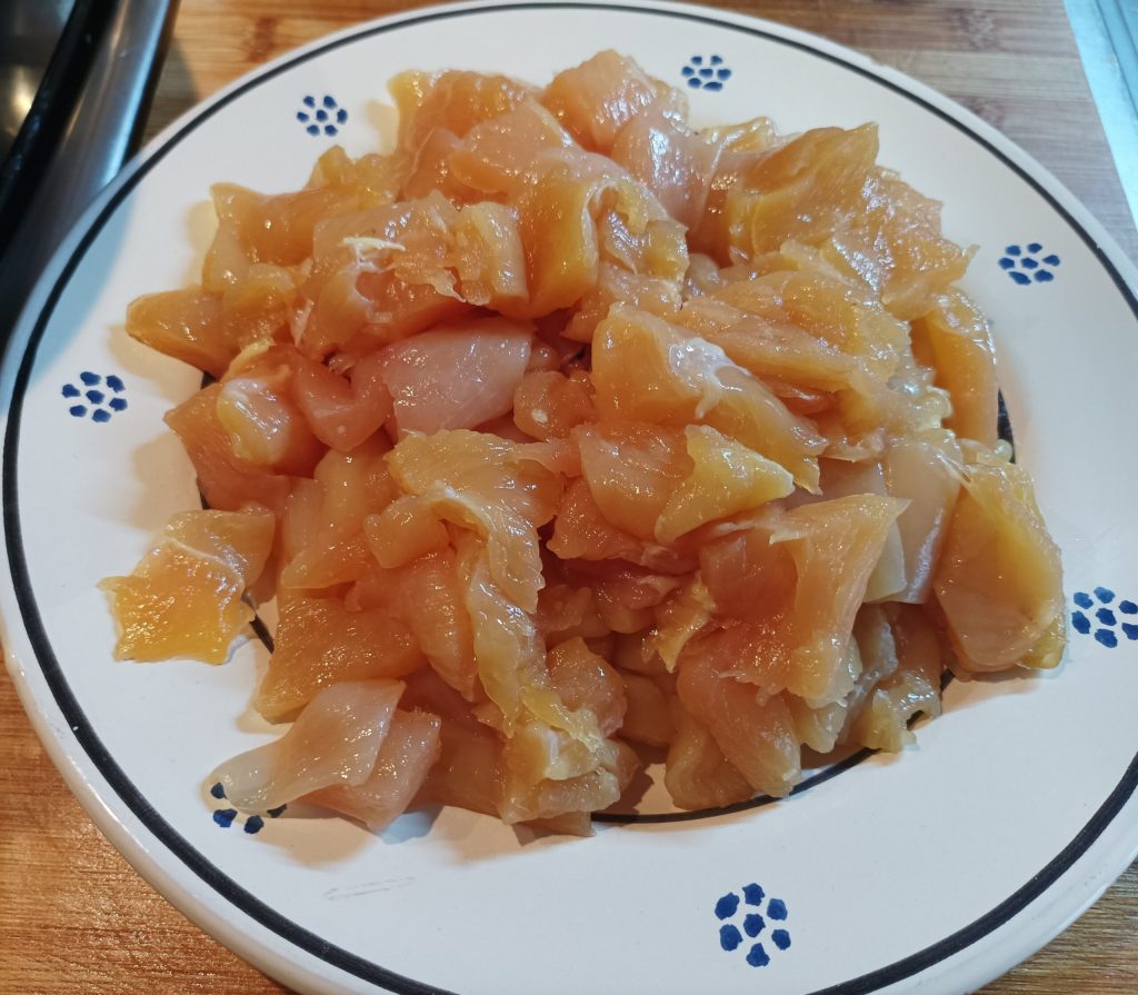 First, prepare some vegetable broth or bouillon. Cut the chicken breast into pieces (I prefer free-range), then wash and chop the vegetables.
