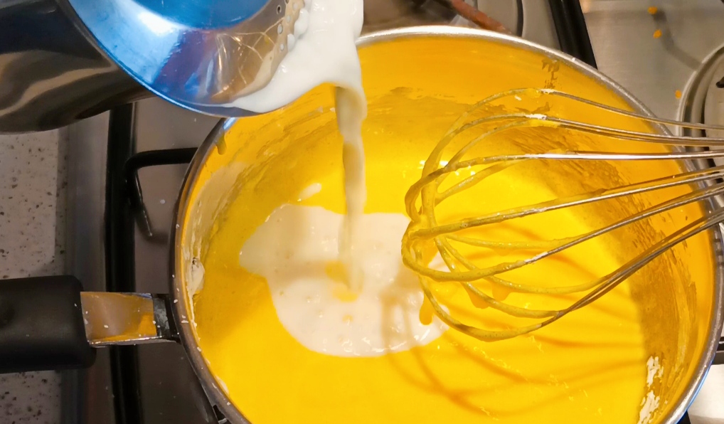 When the milk with the cream is about to boil, pour it little by little into the yolks. If you added lemon peel, remember to remove it before pouring the milk. Turn on the very low flame and start stirring.