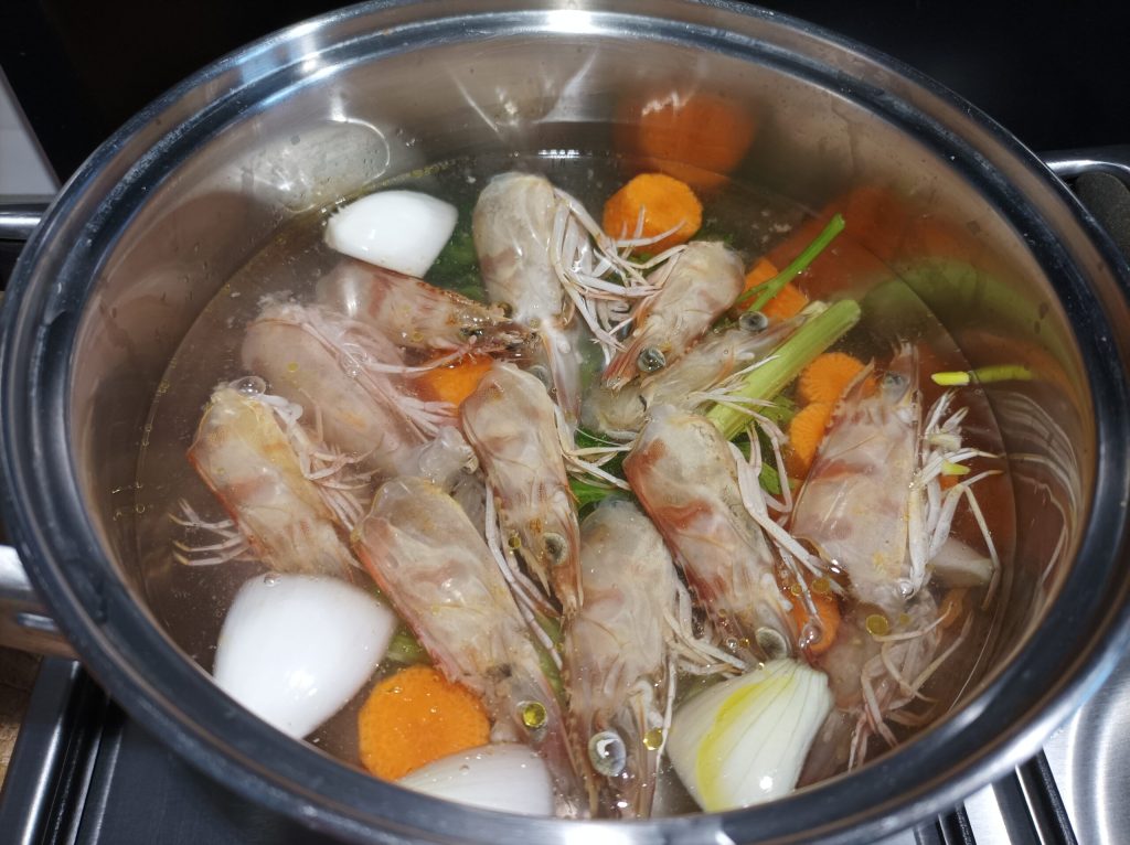 First, if they are not already cleaned, remove the skin, innards, and beak from the cuttlefish. Remove the beak and the skin from the octopus’s head. Remove the heads from the prawns and set them aside for the broth.