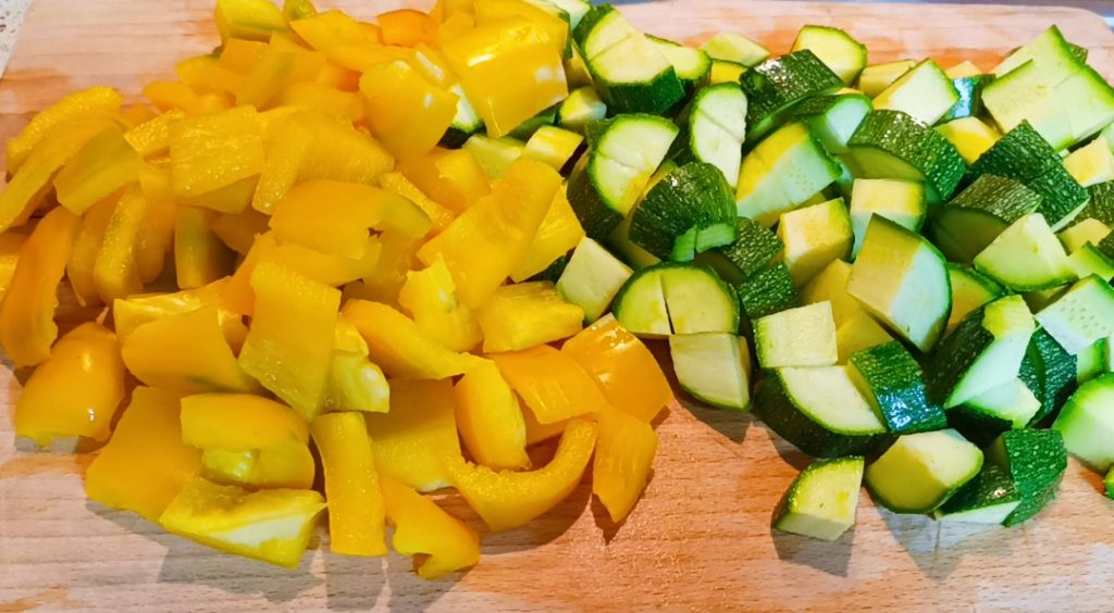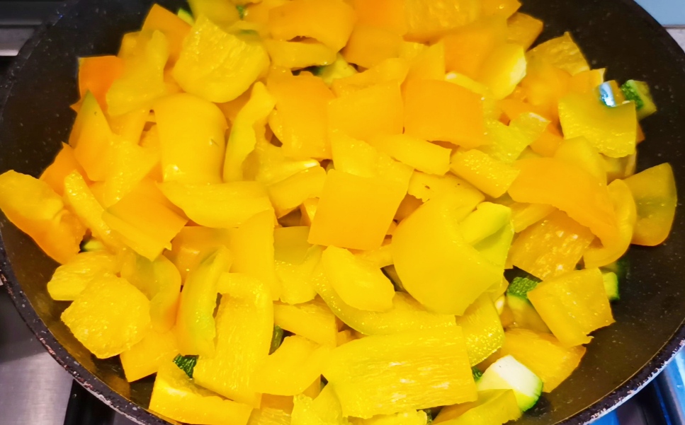 Then add the bell peppers on the zucchinis and cook them for 5/6 minutes. The vegetables should be crunchy.