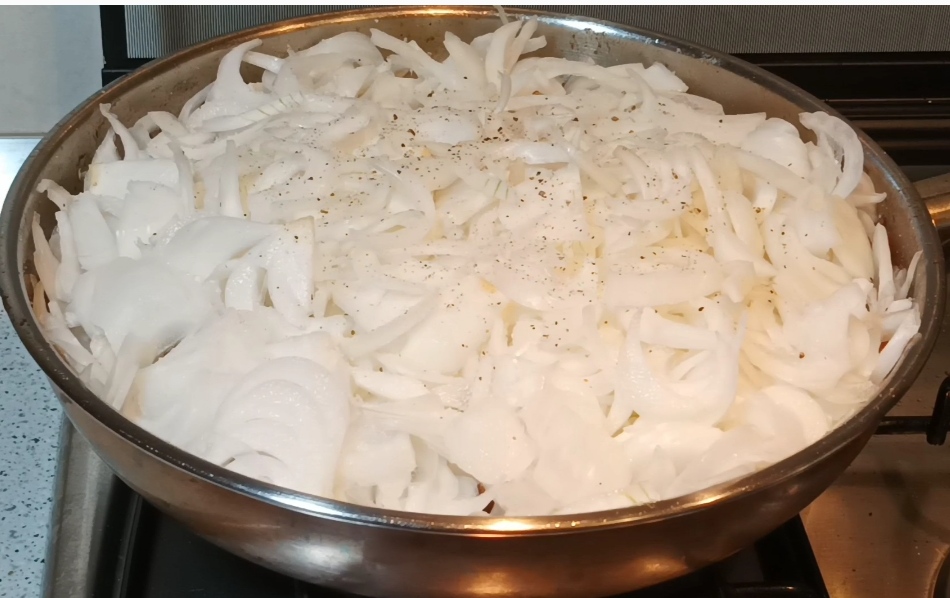 After about an hour, add the onion, salt, and pepper.