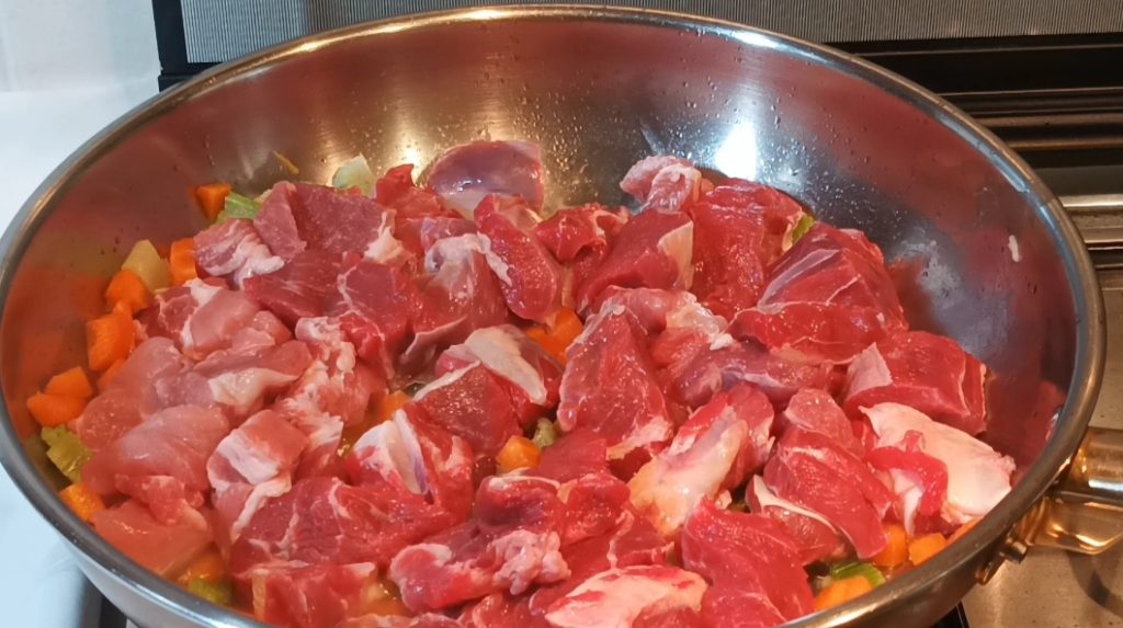 Then add the meat cut into pieces and let it brown.
