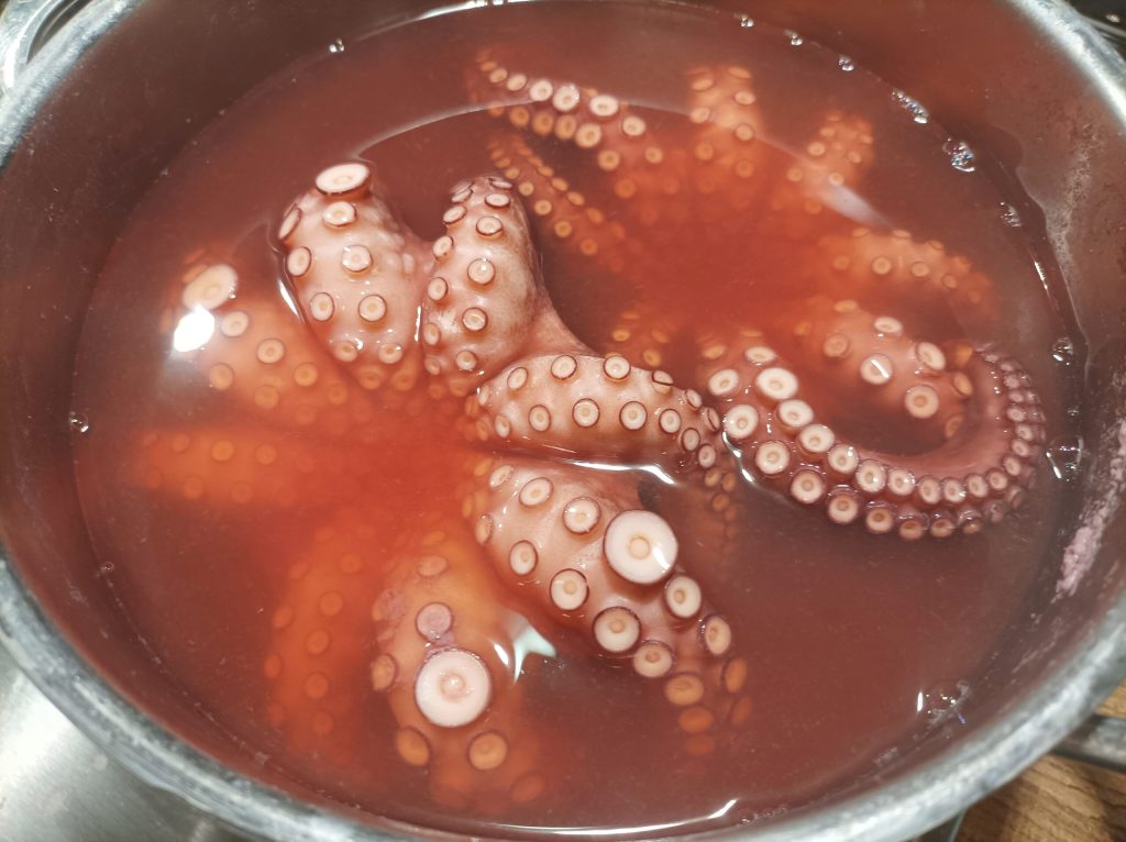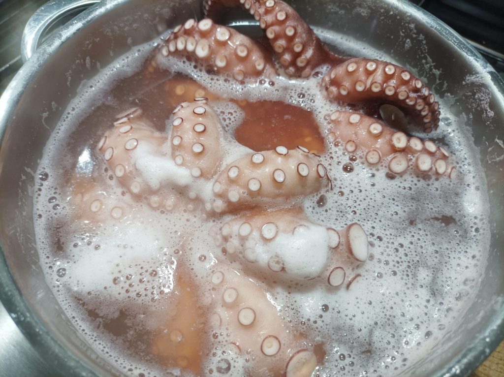 The cooking time may vary depending on the size of the octopus; for 2 octopuses of about 500 g each, 30 minutes will be enough. To check if they are cooked, always do the fork test; if it goes in easily, you can finish the cooking.