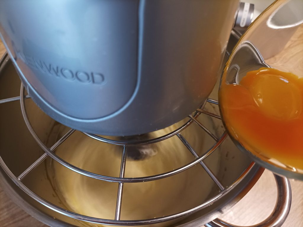 After the time has passed, still with the mixer running, add one egg yolk at a time, then lower the speed, sift the powders and add them to the mixer, increase the speed again to absorb and turn off. The mixture will be compact.
