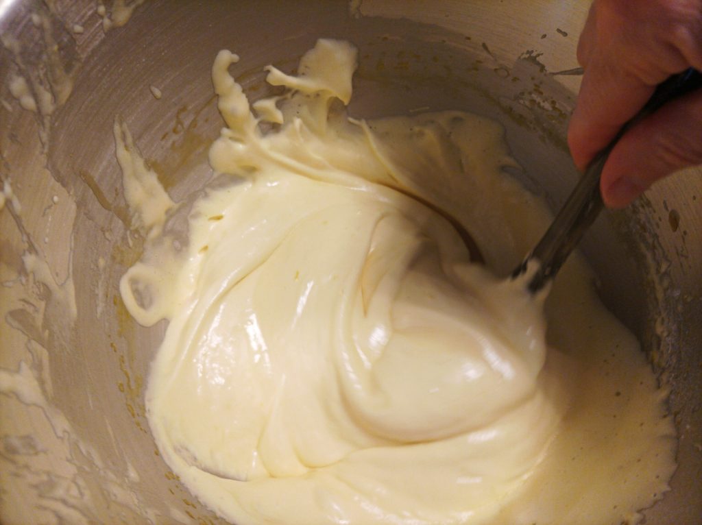 Pour it into the mixer with the rest of the mixture and with the spatula work it from bottom to top.