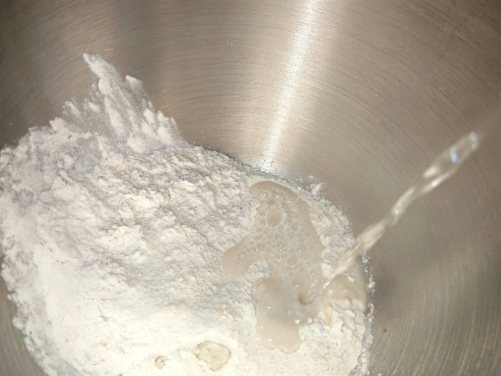 In the stand mixer (or in the bowl if you want to knead by hand), put the flour, salt, and fairly hot water, little by little.