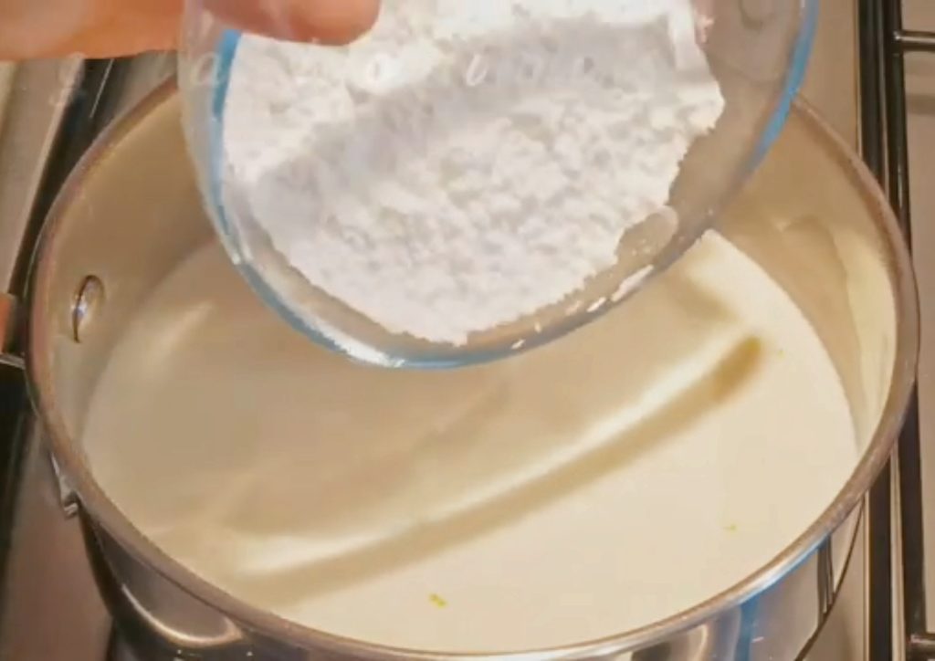 In a saucepan, put the milk, sugar, lemon peel (or vanilla), cream, and cornstarch.