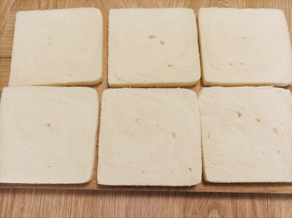 Take the slices of bread and cut them in half diagonally, or vertically to create rectangles. I used crustless bread slices; if yours have crusts, you will need to remove them. Slice the mozzarella and pat it dry with paper towels.