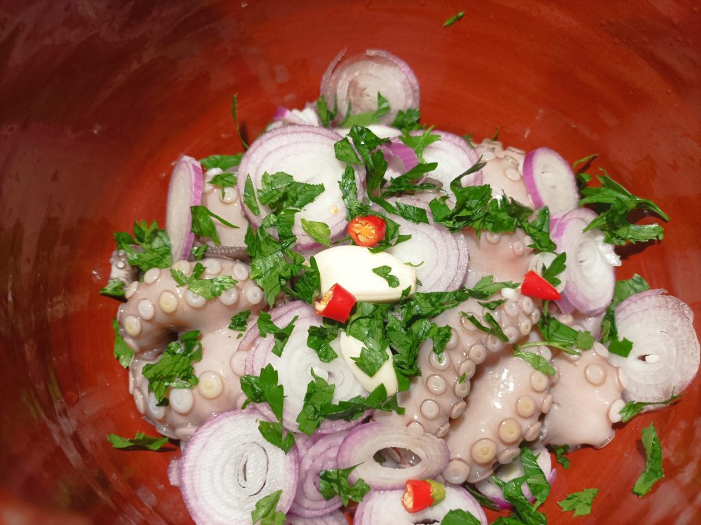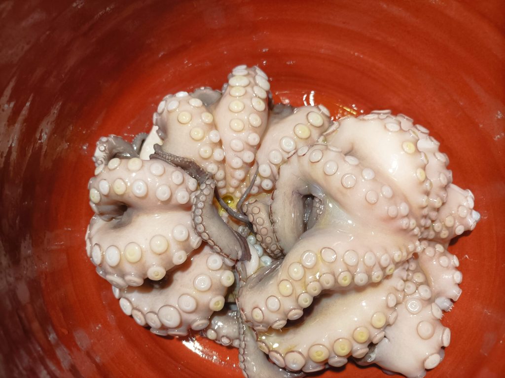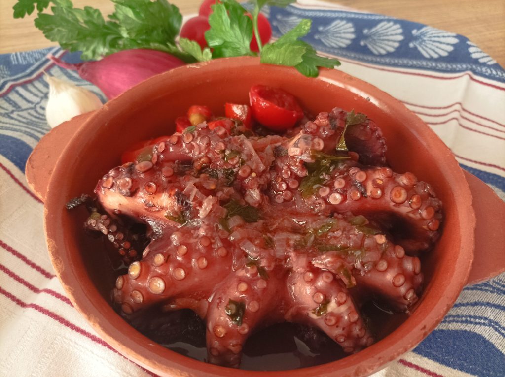 Octopus in their own juice called in Bari L pulp in da l’acqua lor. A typical dish of the Apulian tradition, prepared with very simple ingredients cooked in the water they release during cooking. We Bari locals also use this saying to describe someone very grumpy and difficult to deal with, so they need to be “left to stew in their own juice.” In Bari, we find already curled octopuses in all the fish markets, but if this is not possible, simply blanch the tentacles in boiling water. Octopus here is cooked in various ways, with potatoes, with sauce, roasted, fried, in salads, etc., but the best way to enjoy it is raw. It is a staple, especially on holidays. In this recipe, the octopus will be tender and flavorful, thanks also to the earthenware pot cooking. Now I’ll leave you to the recipe. Try it!!