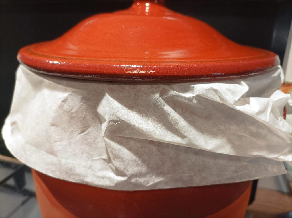 Before placing the lid, put a sheet of parchment paper on the pot and then the lid. This will keep the moisture inside. Turn on over low heat and let it cook for 1 hour and a few minutes, always check the cooking with a fork, if it pierces easily it means it’s cooked.