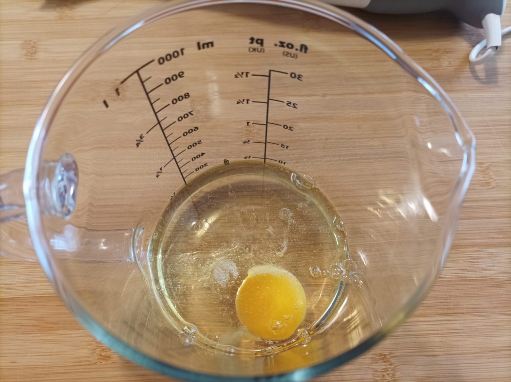In a tall and narrow container, add the egg, oil, lemon, and salt in the order listed above.