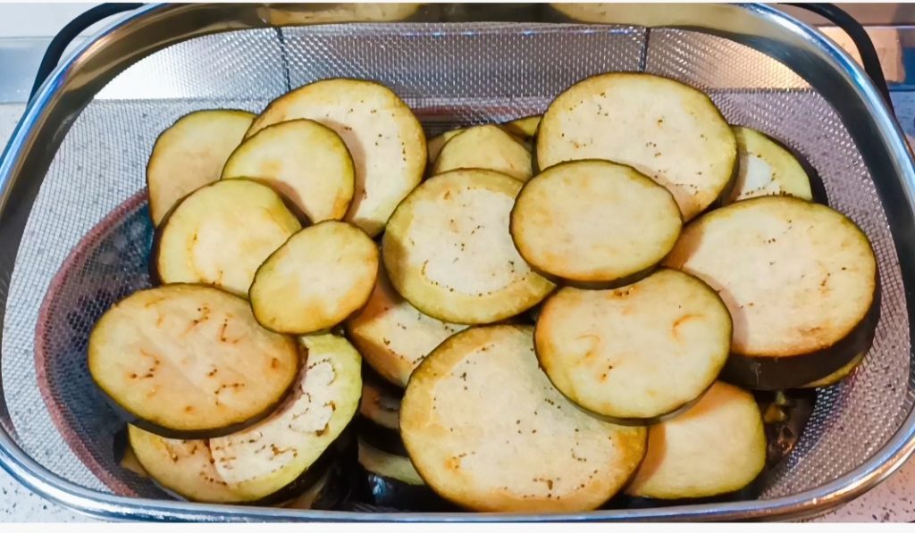 After 2 hours, the eggplant will have released water. Rinse and dry it in a spinner or place it on a towel and blot it with paper towels. Once well dried, you can fry it.