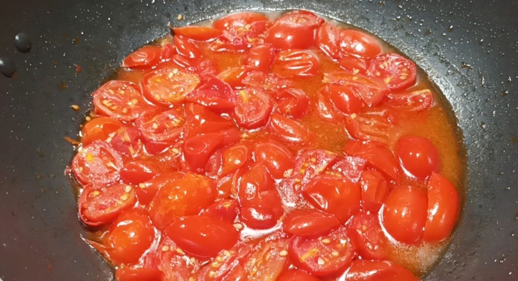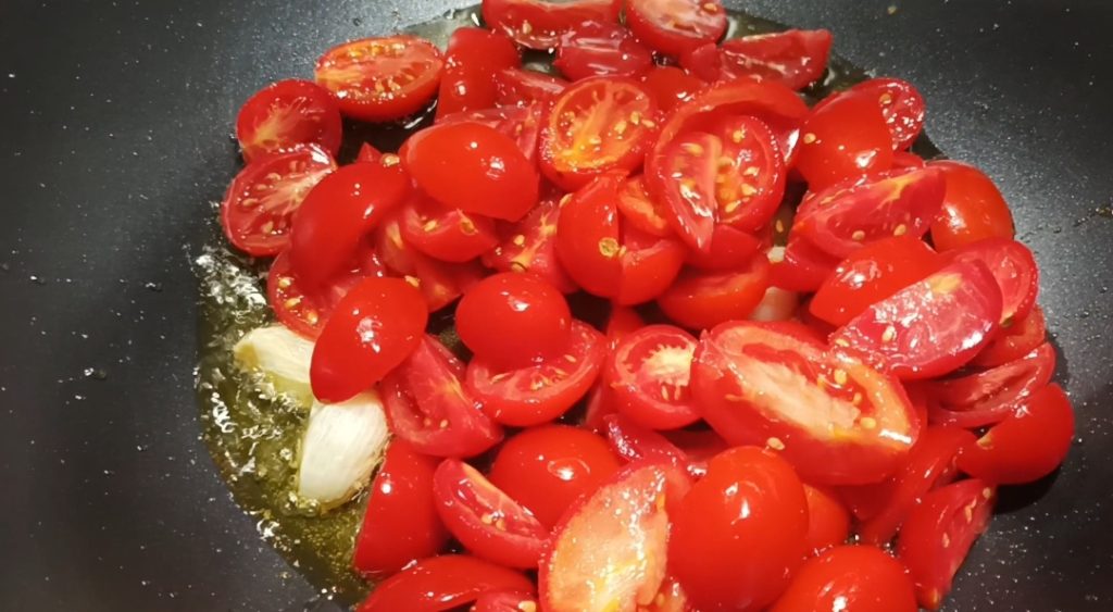 The green beans are ready; drain them but keep the cooking water, as you’ll cook the pasta in it. Prepare the sauce, cut the cherry tomatoes in half or quarters depending on size, put oil and garlic in a pan, fry without burning the garlic.
