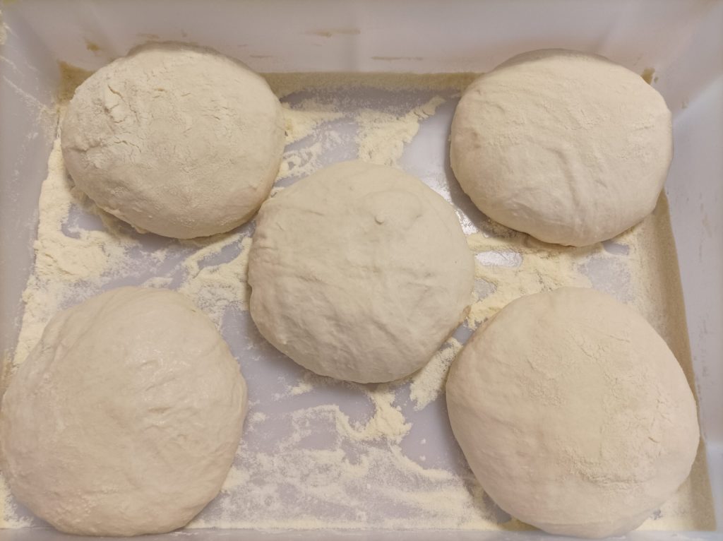 • After the rising time has elapsed, it’s time to portion the dough. Cut the dough into pieces forming dough balls (each about 7 oz for one pizza), place them in a container or on a floured surface, then cover them and let rise for about 3 hours.