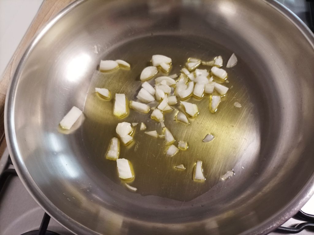 When the vegetables are ready, pour them into a container, add just under a ladle of broth, and blend, making the vegetables into a cream. Set it aside.