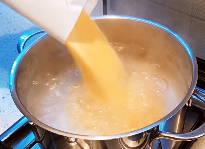 In a pot, put the water. When it reaches a boil, add the salt and pour in the polenta.