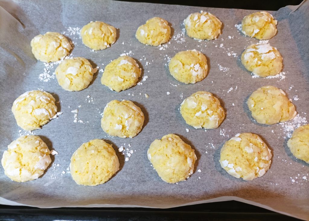 On a baking sheet, place parchment paper and lay the dough balls spaced apart. Bake at 340°F in a preheated fan oven for 15 minutes. At the end of cooking, they will be golden with cracks on the surface.