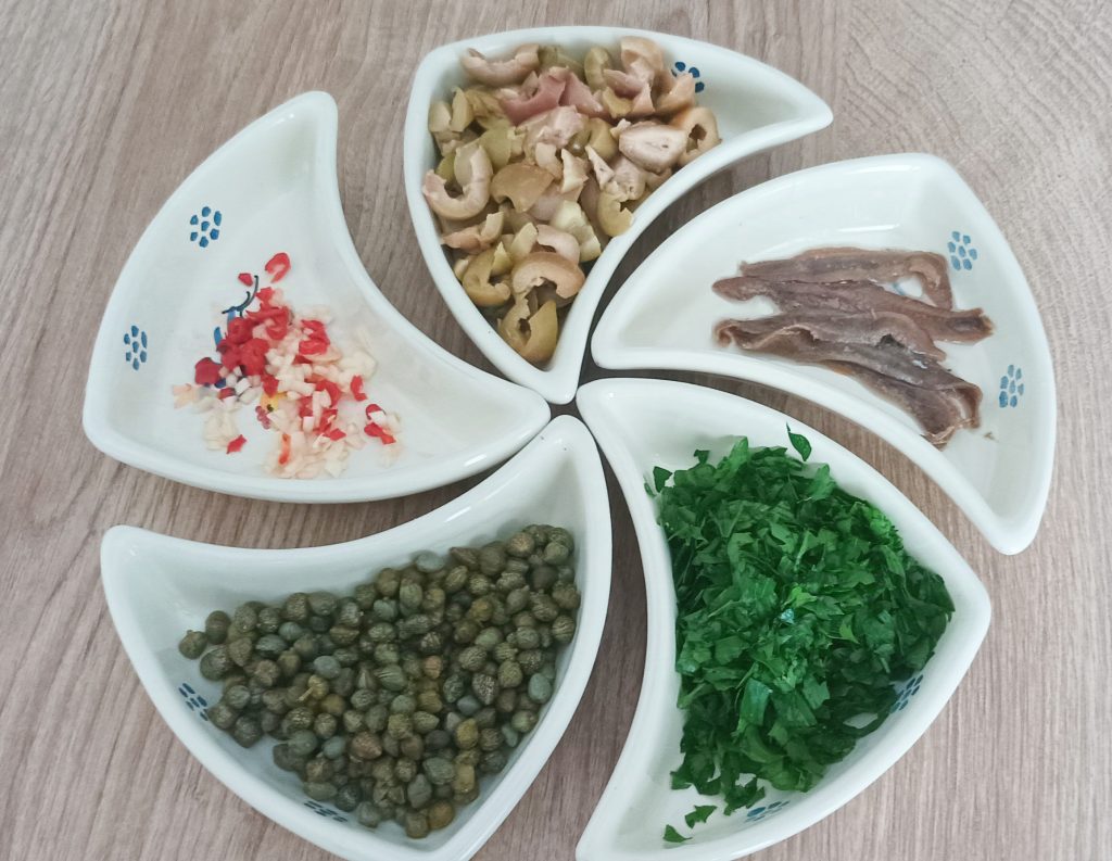 In the pan, slowly sauté garlic, oil, and chili pepper, after about 2/3 minutes add the anchovy fillets and continue to sauté for another 2 minutes, until they dissolve.