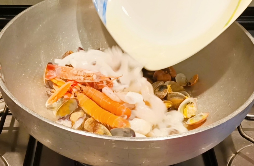 Add the seafood and cook for 2 minutes, then deglaze