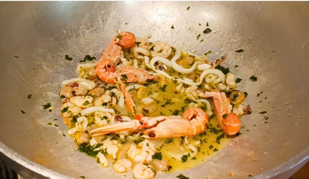 When the pasta is cooked, reheat the seafood and add a ladle of cooking water.