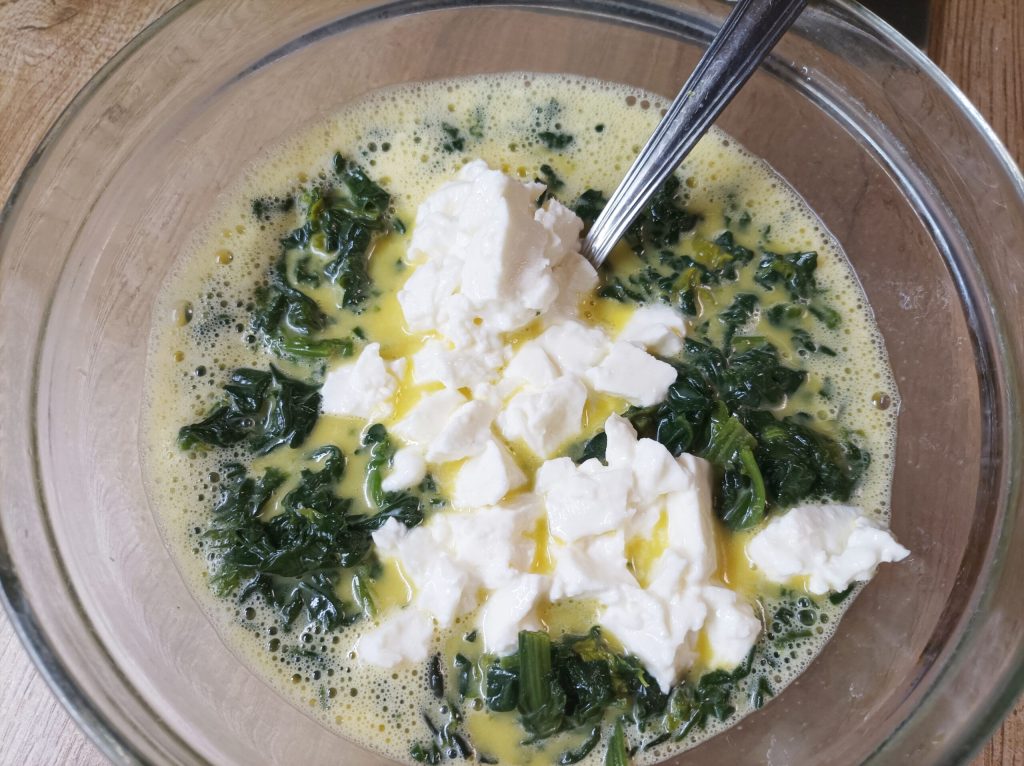 In a container, beat the eggs, add the spinach, chopped mozzarella, Parmesan, salt, and pepper. Mix everything.