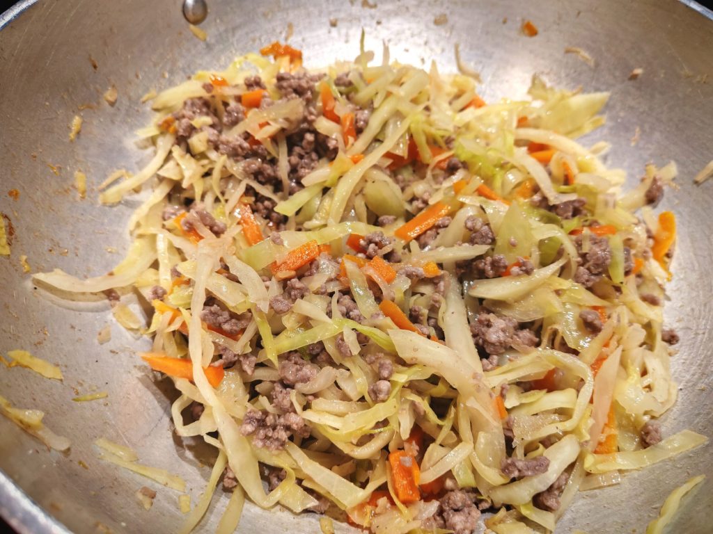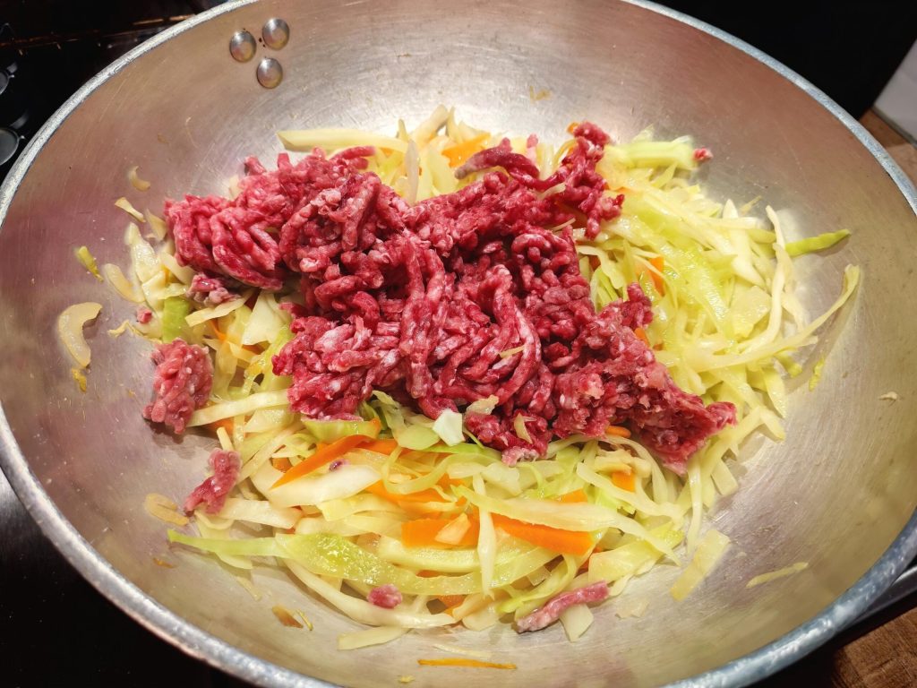 • Cook for a maximum of 15 minutes, just enough to cook the meat a little and the cabbage, but the vegetables should remain crunchy.