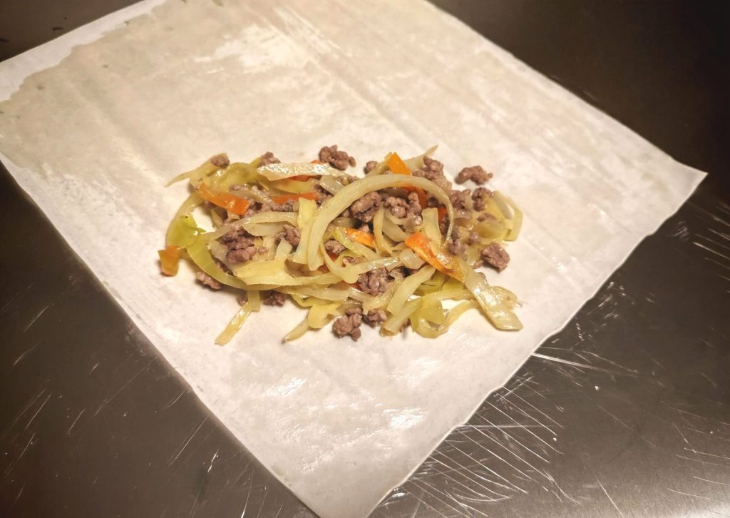 • Roll the tip of the sheet over the filling, pressing to adhere. Handle it gently as it may tear.
