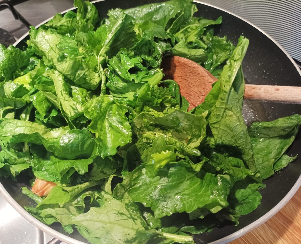 As soon as the oil is very hot, add the broccoli rabe, (beware of splashes).
