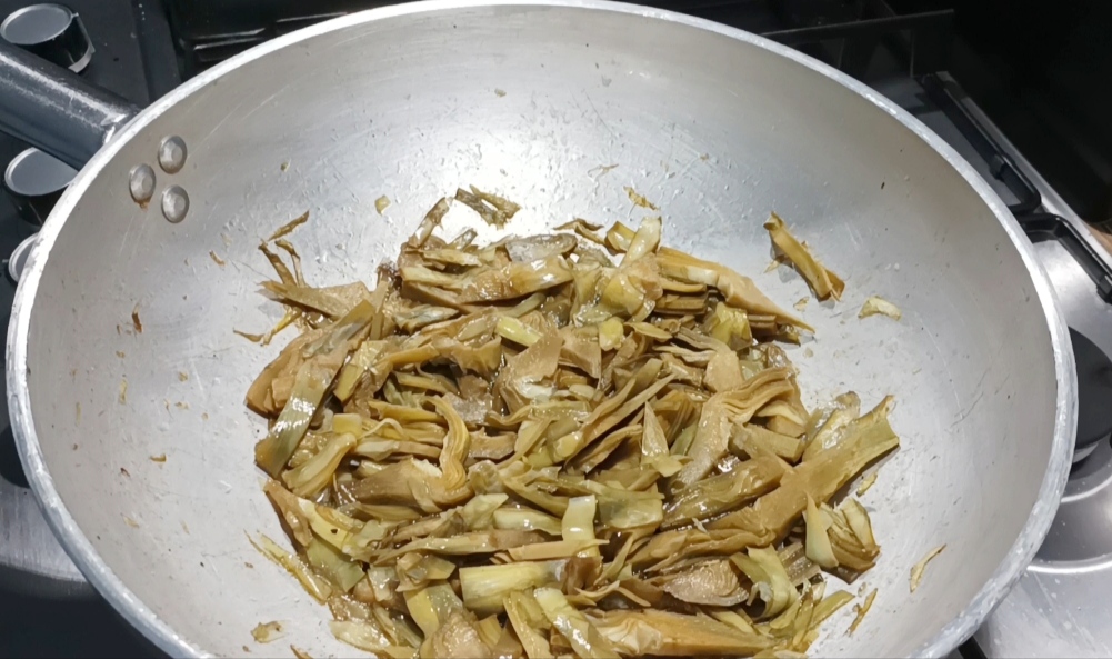 When the guanciale is ready, remove it and set it aside. In the pan where the guanciale fat remains, add the sliced artichokes, salt, and pepper. Cover and cook gently for about 10 minutes. Meanwhile, put on water to boil for the pasta.
